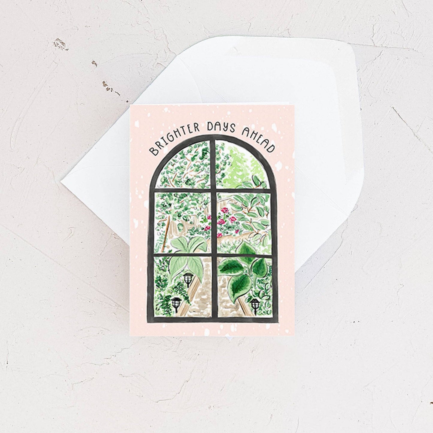 Deliver a meaningful message with this mini card that’s blank inside, allowing for a personal written note. Brighter Days Ahead is printed above our hand drawn art illustration, which depicts a bright-breezey leafy garden path as seen through a window. The scene is benevolent and simply joyous, with lush greens and florals, sure to brighten anybody’s day. Drawn with love, this art card comes in our mini card format of 3.5" x 2.5", a perfect size to place a gift card inside, or attach to floral arrangements, and to small gifts.