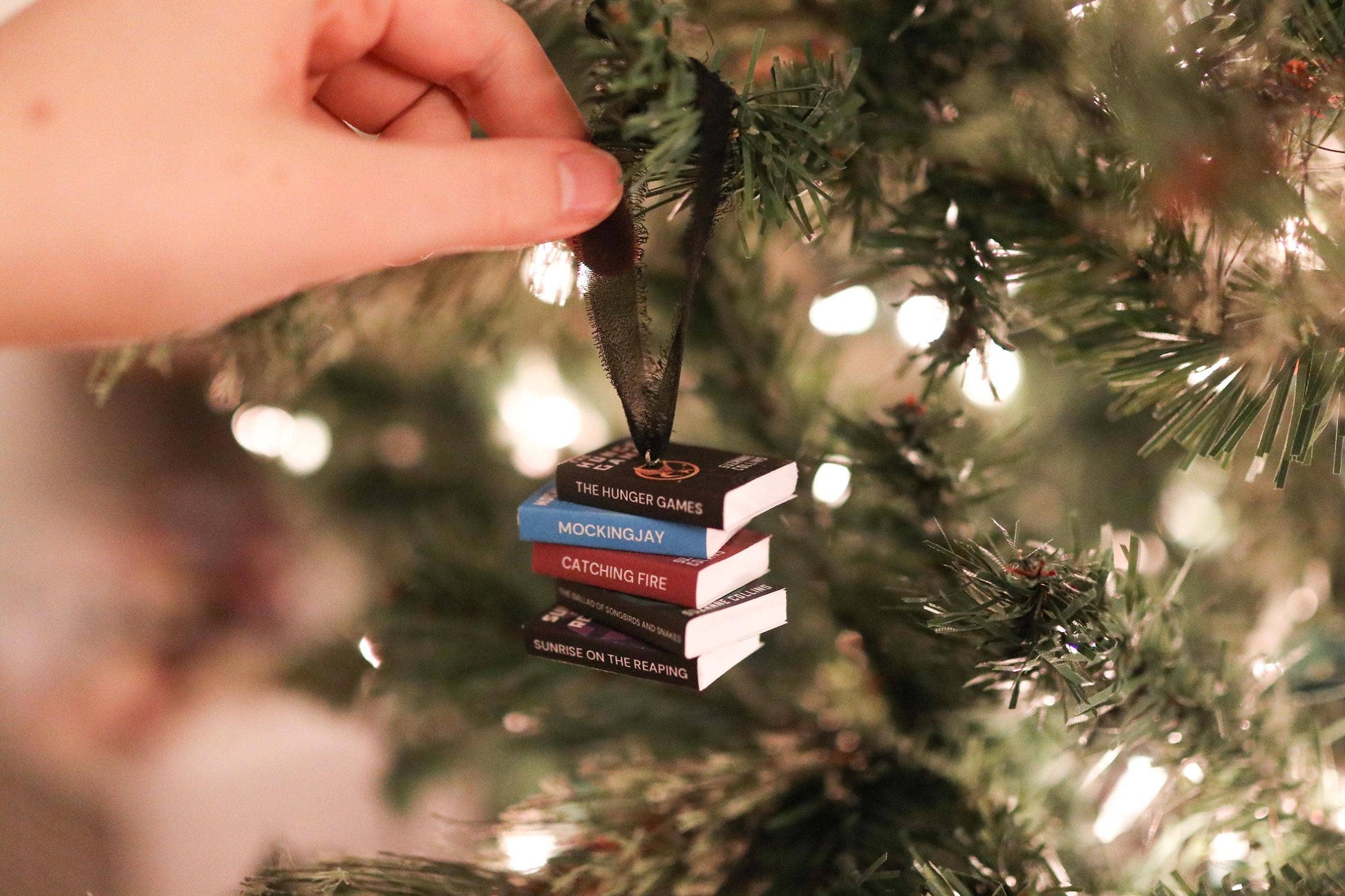 A handmade stacked mini book ornament inspired by the Hunger Games series!
